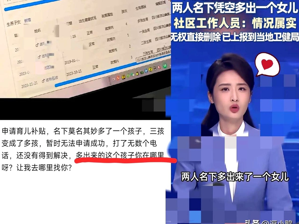 “多出来那娃是谁的?”——成都妈妈李蕾在街道办窗口听见这句话,当场愣住。她只想领三胎补贴,系统却蹦出四个孩子。工作人员调出户籍底账,发现多出一名2019年在广安某乡镇落户的男孩,母亲栏赫然写着她的名字。李蕾回家质问丈夫,丈夫沉默,婆婆却先哭:那是当年在外省生的,一直寄养在亲戚家。