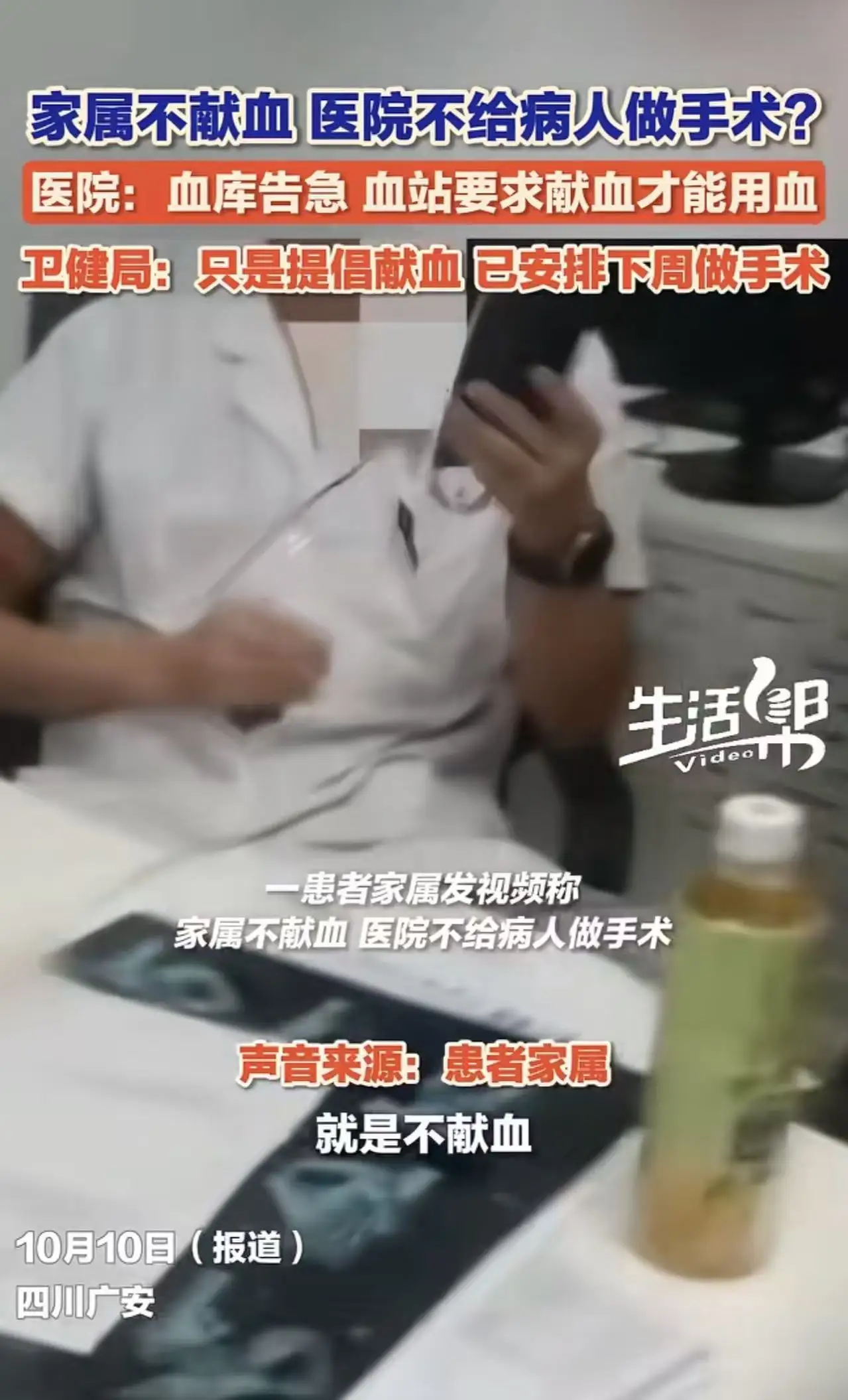 炸锅icon了!四川广安,一患者家属发视频称:家属不献血,医院不给病人做手术!”而医院工作人员回应:血库告急,血战要求献血才能用血,我们也没办法。卫健局:只是提醒献血,没有强制!网友:和医护有啥关系啊,巧妇难为无米之炊!