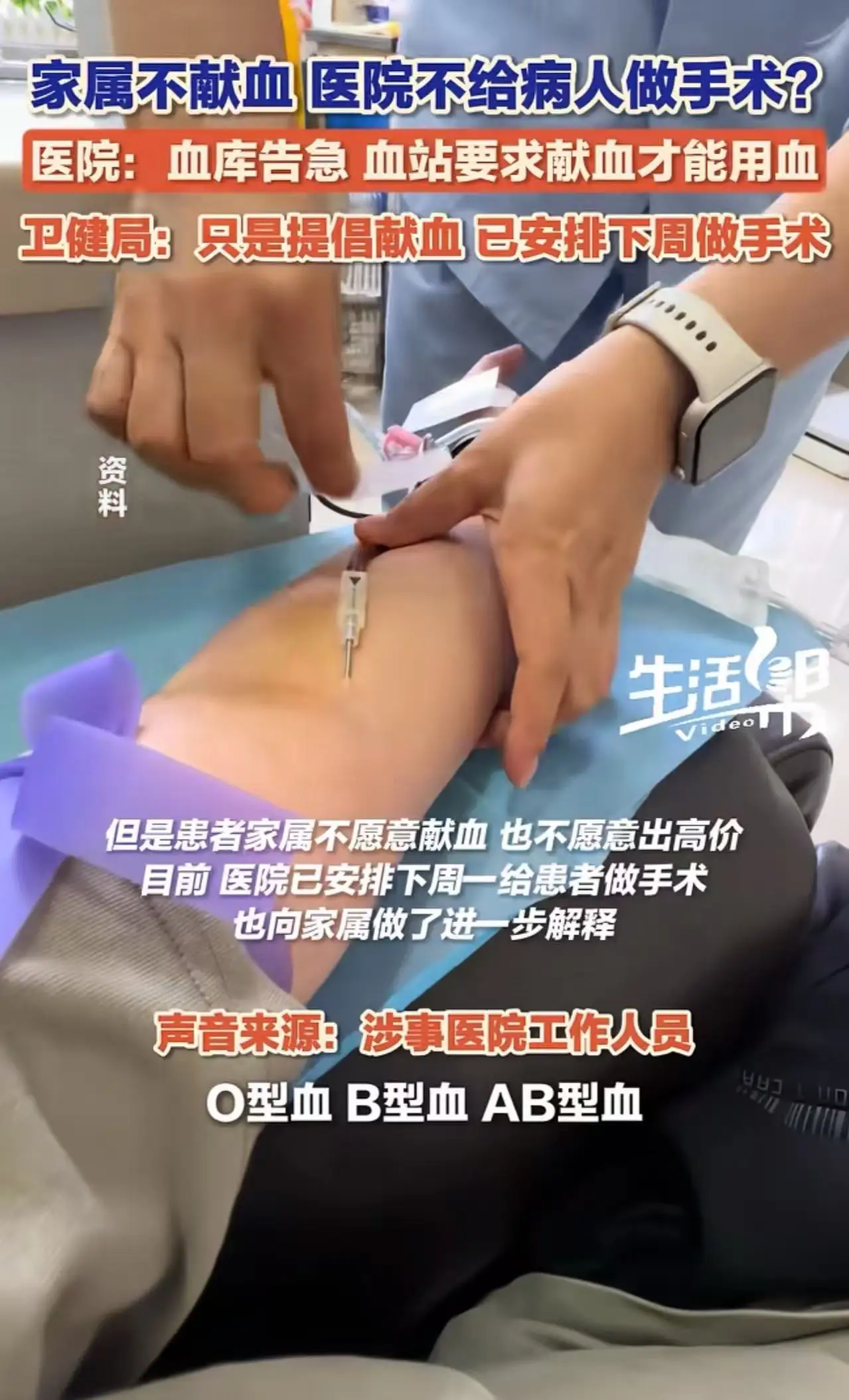 事情的起因很简单,却激起了轩然大波。一位患者的家属在视频中怒气冲冲地控诉:“医院不献血,就不给做手术!”一句话,像扔进平静湖面的石子,激起了千层浪。有人愤怒:这是“人命关天”的问题,医院竟然要借血来“换命”?有人无奈:血库告急,谁能怪医院?更有人质疑:这背后,是制度的缺陷,还是医患关系的裂痕?